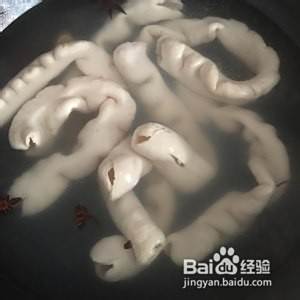 洗干净的猪大肠,凉水下锅加料酒、姜片、八角焯水,焯水后捞出控干。
