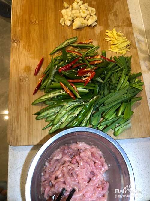 青椒切片 蒜苗切段 大蒜切成大颗粒 姜切丝 备用肉切丝加入适量料酒 鸡粉 蚝油 嫩肉粉 食用油搅拌均匀,腌制用