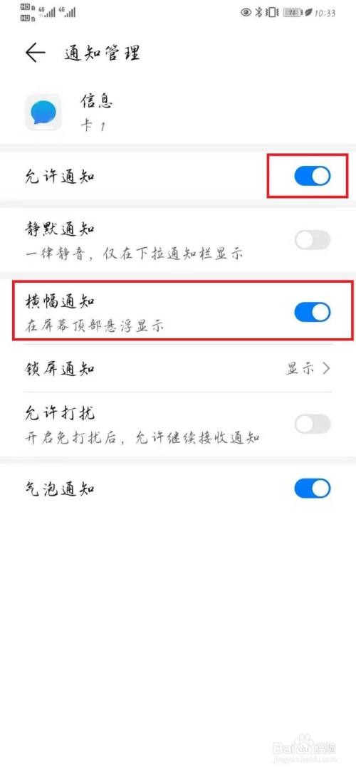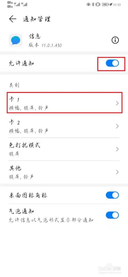 进入卡1信息通知设置页面,点击开启【允许通知】并选择开启【横幅通知】开关设置即可。如下图所示。