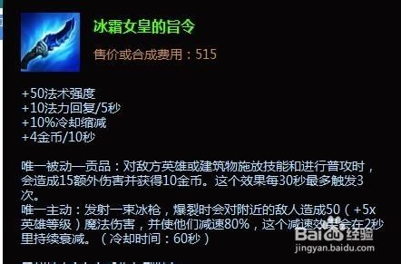 第一个大件推荐是冰霜女皇的指令,这个装备配合E技能可以很好的限制对方行动,有不错的效果。