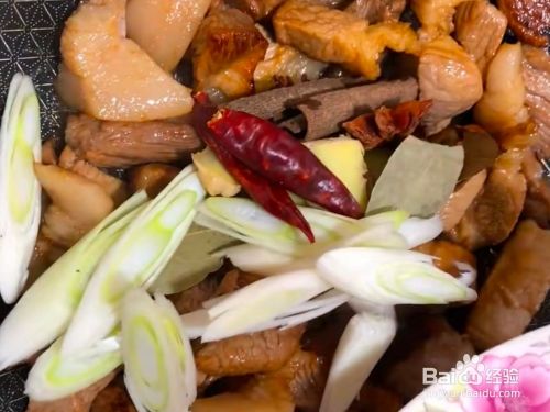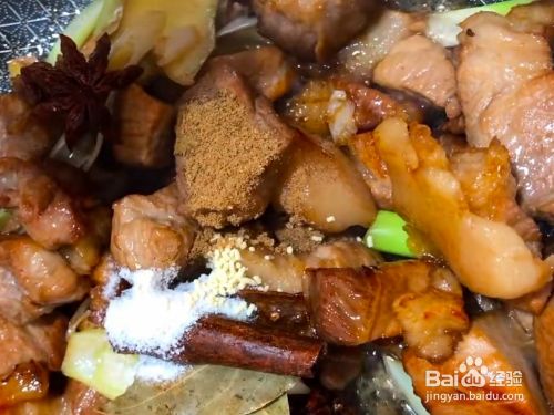 再放入提前焯过水的五花肉,翻炒上色,再加适量八角适量,桂皮,香叶,干红辣椒,盐鸡精,十三香,调味。