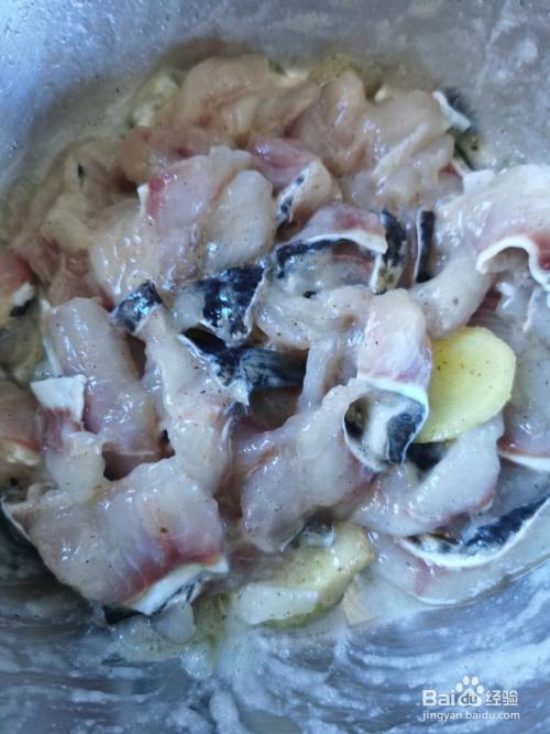 鱼片片好后加入淀粉,一个蛋清,盐,姜片,酒,用手抓均匀,腌制20分钟。所有鱼骨另放一个碗,加入一个蛋黄,配料跟鱼片一样,同样腌制20分钟。