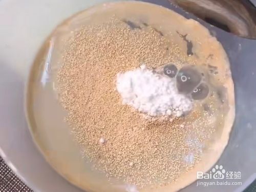 先取160克温水加上3克酵母粉和2克泡打粉,5克白砂糖,搅拌融化,备用。