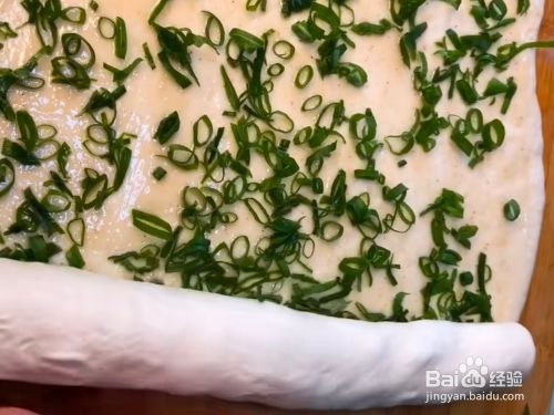 再在干好的大薄饼上边刷上调好的油酥,撒上小葱花,从一边卷起、备用。