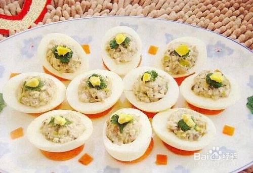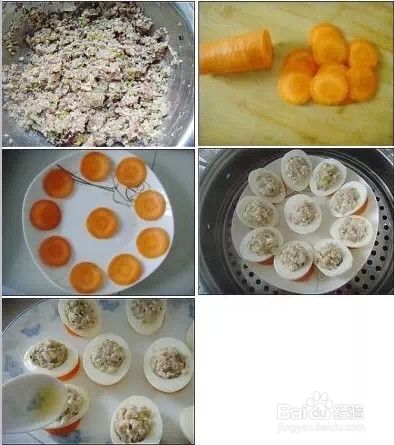 12.将调好的馅料填入蛋白,然后将填好馅的蛋白放到胡萝卜片上。蒸锅中放适量水,用大火烧开,将装好盘的鸡蛋上屉蒸约10分钟