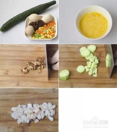 主料:剩饭500g、青瓜20g、鸡蛋50g、杂蔬100g、香菇10g、虾仁20g