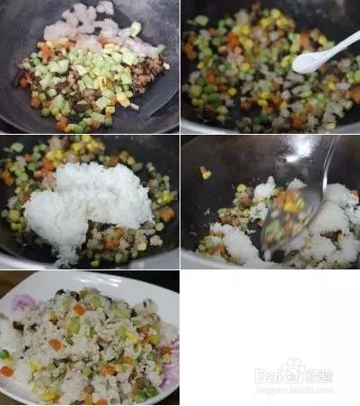 6.锅内热油至七分热时倒入除剩饭外所有的炒饭材料翻炒两分钟