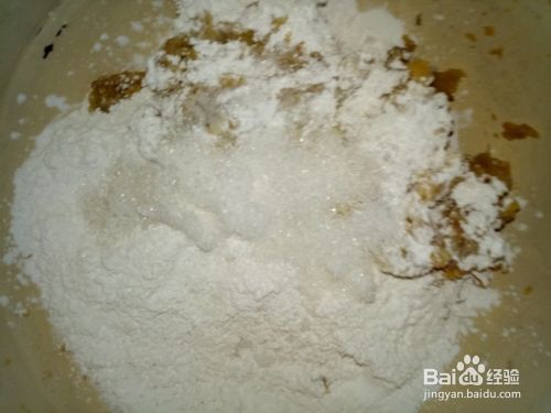 在捣碎的地瓜泥内加入适量的糯米粉和三小勺的白砂糖。用手搅拌均匀。地瓜的糖度比较低,加糖能增加甜度。