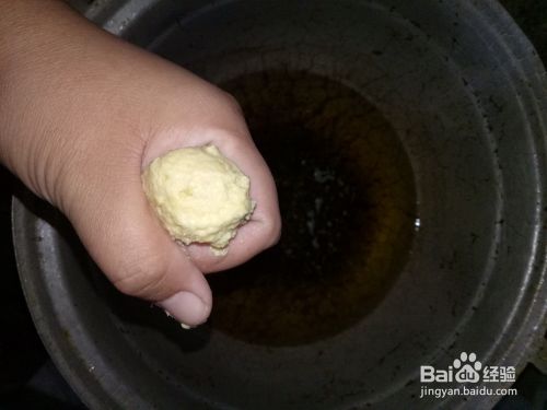 锅内加入适量的油,烧热,用左手把地瓜泥挤成丸子状,右手用勺子把丸子送到锅内。