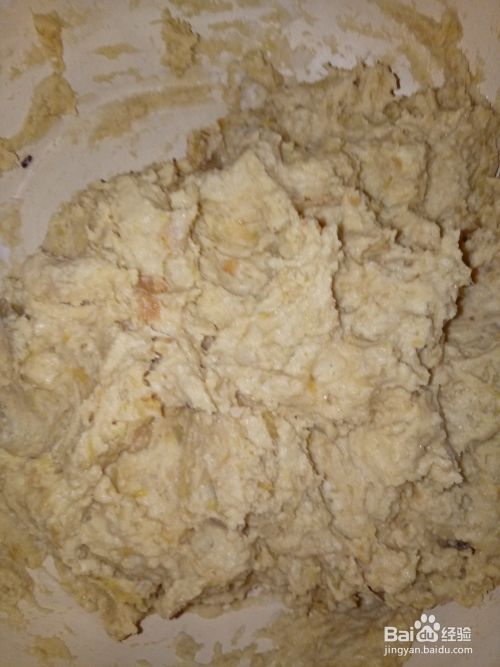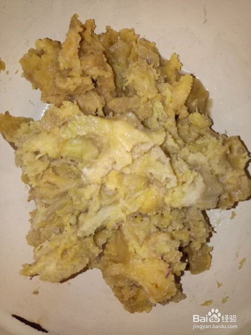 去掉地瓜皮,把去掉皮的地瓜放到容器内,用勺子捣成泥状。把捣不碎的丝状物取出丢掉,避免影响口感。