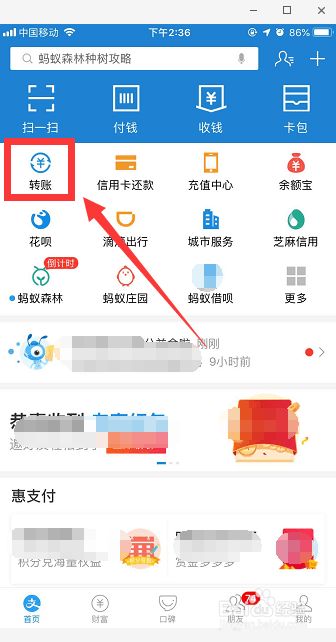 打开支付宝,点击“转账”,如果首页没有,可以进入“更多”找。