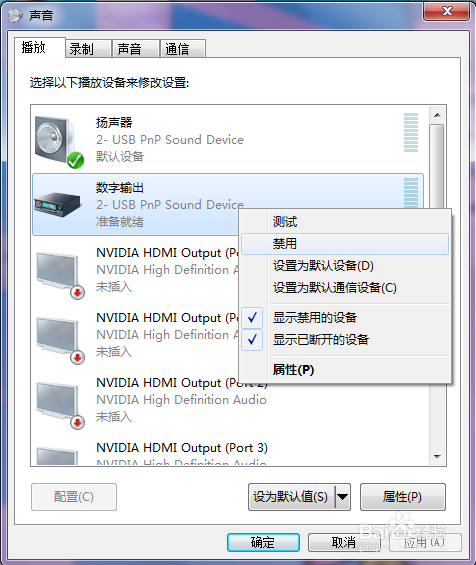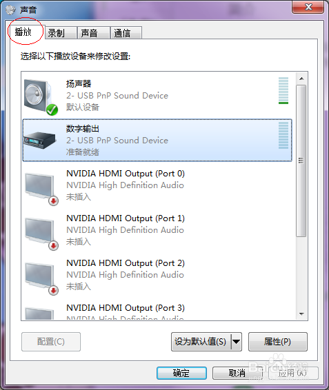 选择播放选项卡,可以看到下面有扬声器、数字输出(怀疑是USB独立声卡通病)。