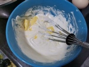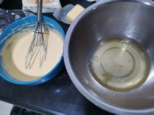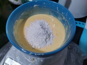 最后加入低筋面粉搅匀即可,动作要快,让蛋黄芝士混合物保持温度,面粉不容易结块出现颗粒