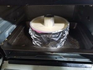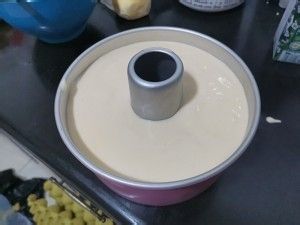 给模具穿上三层锡纸,请一定不要把锡纸弄破,放入深烤盘,加入2-3cm深的开水(用80度左右热水更好但是家里没有温度计了),上下火130度烤1小时15分钟。