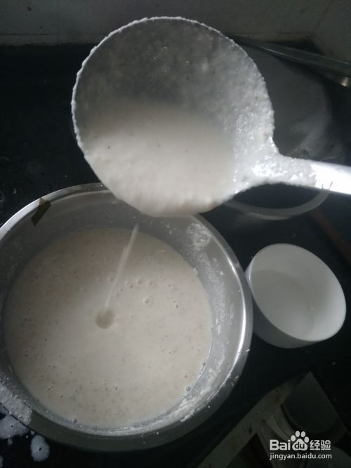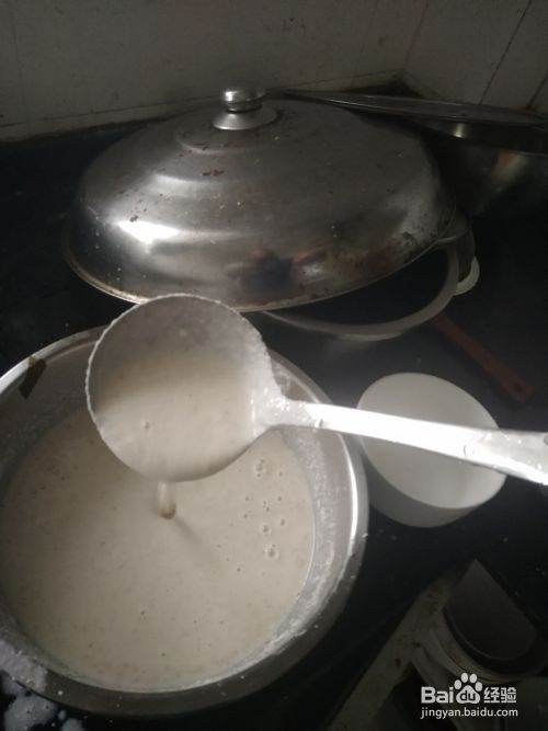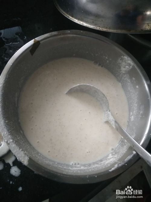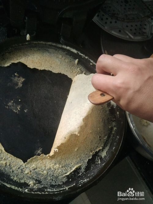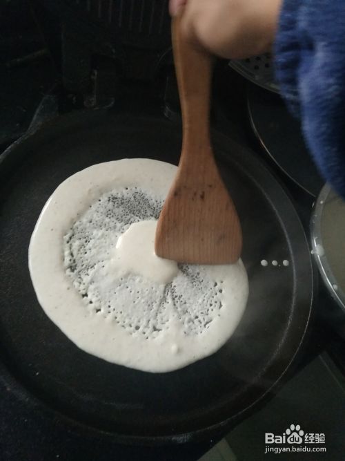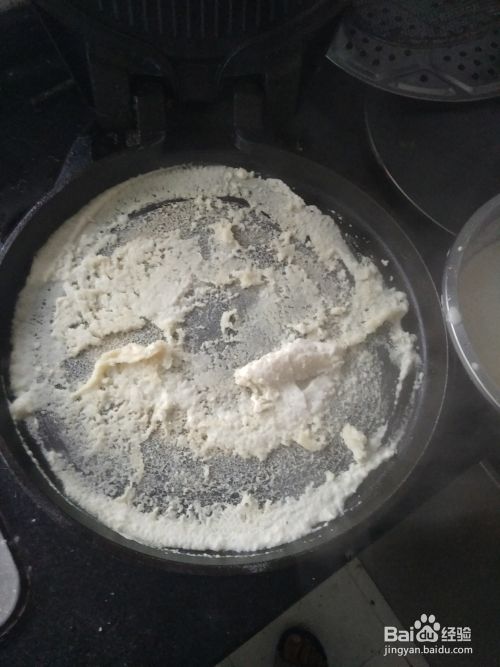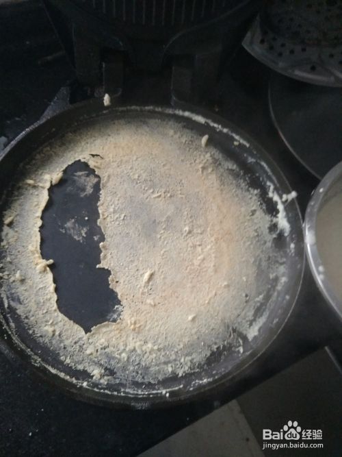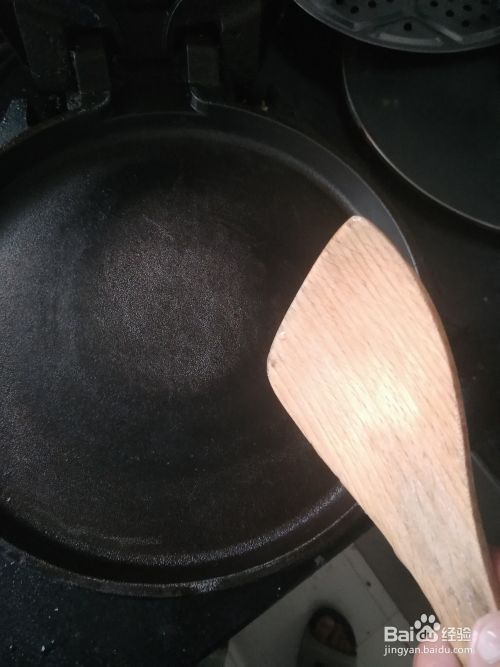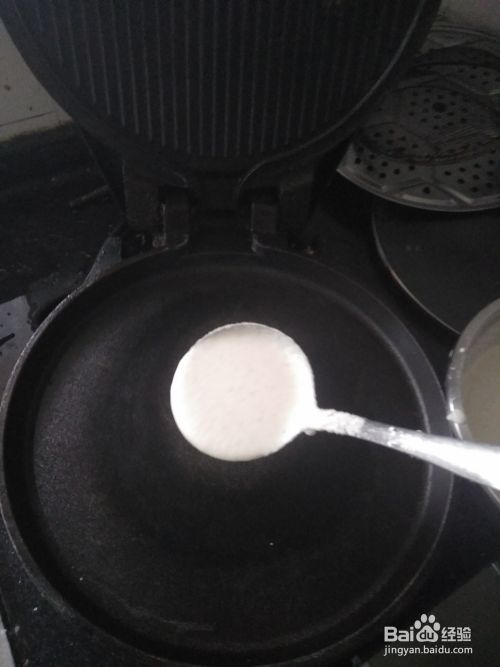 电饼铛加热倒入一勺面汤开始烙制,用面勺子将面汤摊平