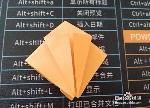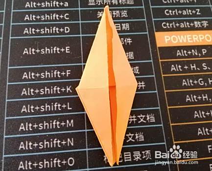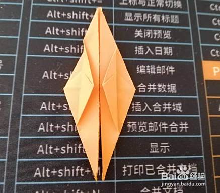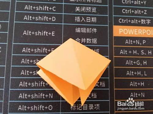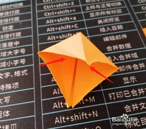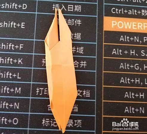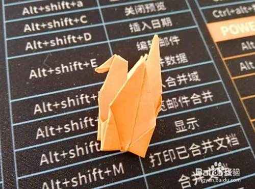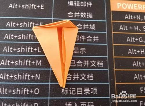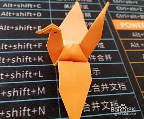 将下面的向上折叠,再向左换一页,然后将中间的顶端向下折叠后打开一个角度,形成了千纸鹤的头。