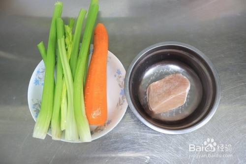 芹菜清洗干净,胡萝卜刮皮清洗干净;瘦肉用冻肉或者鲜肉均可;