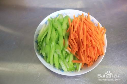 芹菜和胡萝卜切细丝;