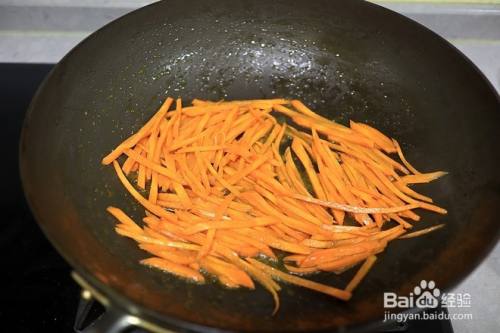 另起锅,倒少许油,胡萝卜丝入锅翻炒;胡萝卜水分少,油少干扒拉易糊锅,淋少许水增加湿度,利于胡萝卜均匀受热、成熟;