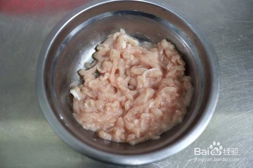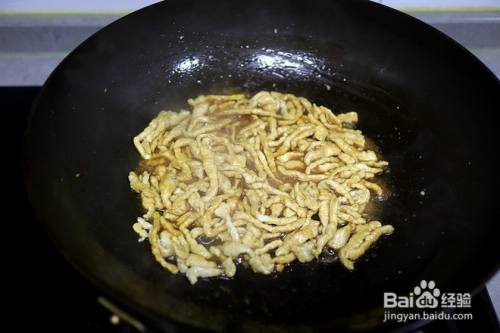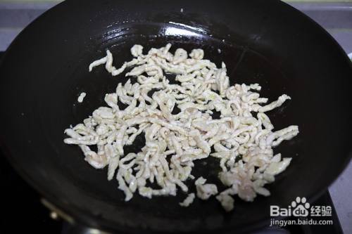 热锅凉油,肉丝入锅,用铲子迅速划散,随着温度上升,肉丝根根独立并变色;