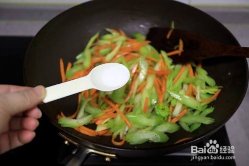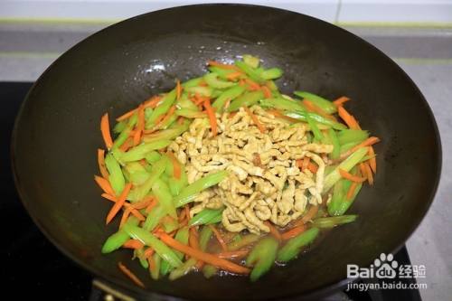 胡萝卜变软,倒入芹菜,大火翻炒;