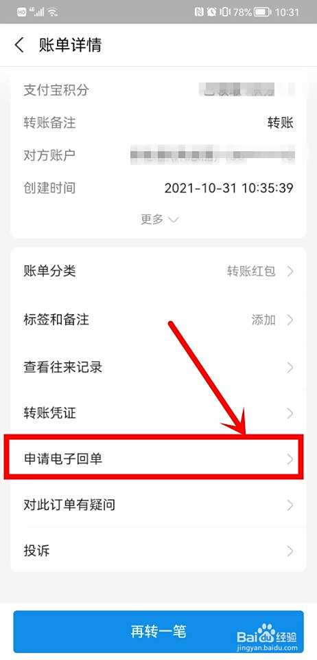 在好友转账记录界面,点击申请电子回单,发送邮件即可查看好友手机号,具体操作步骤如下: