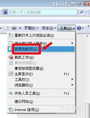 如果还不能清静,那就手动清理IE浏览器的加载项:IE浏览器工具栏→工具→管理加载项