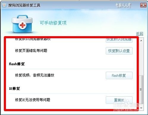 菜单中有各种异常处理的修复菜单,甚至还可以重装IE浏览器(搜狗浏览器也有IE内核)。