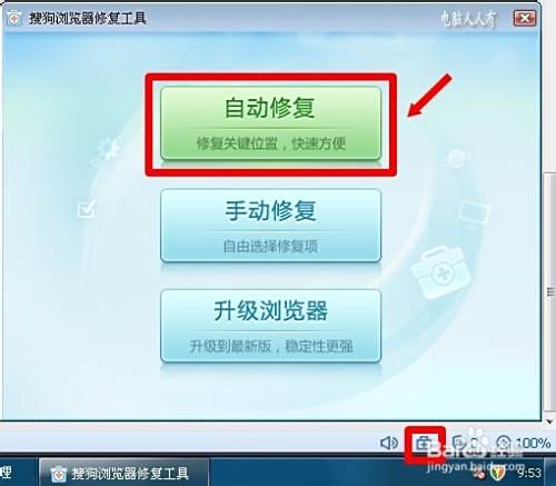 使用的是搜狗浏览器,自带浏览器修复工具。点击浏览器右下角十字图表→自动修复