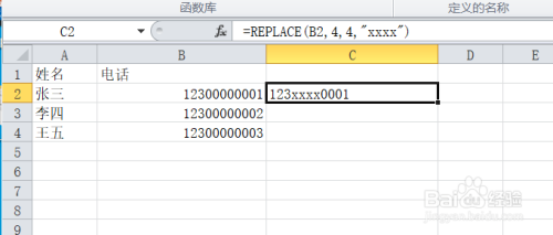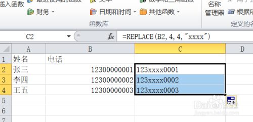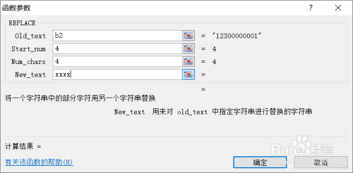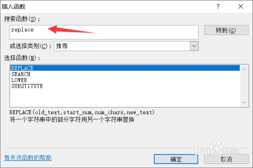 点击之后显示如下界面, 我们在此界面上找到replace函数,之后我们点击此函数,之后弹出以下界面,我们在这里输入值,B2是我们原来输入电话号的单元格,4是要替换的数值在单元格中的位置,我们需要替换四位,所以在第三个输入框中也是4,输入完成之后我们点击确定。