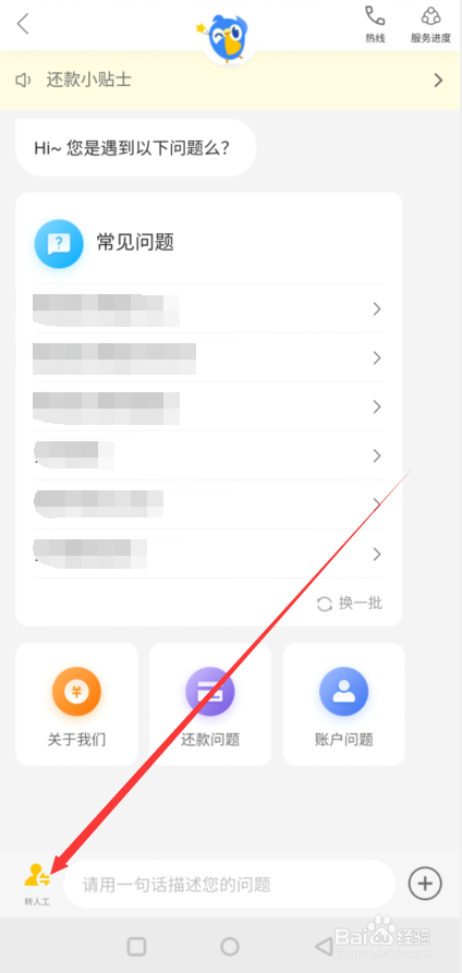 在左下角点击【转人工】,再输入自己的问题即可和客服联系沟通。