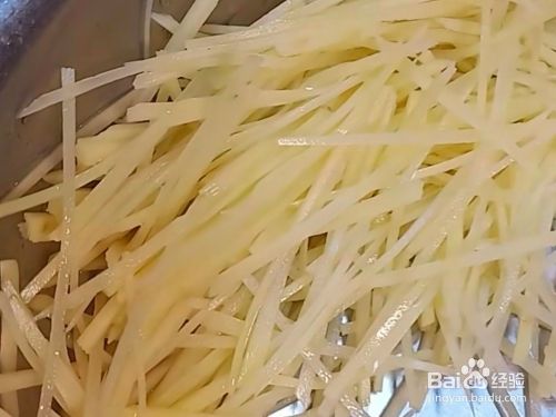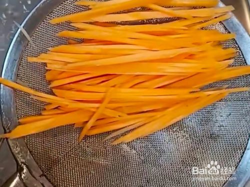 然后起锅烧水,水开下入土豆丝焯烫一下,捞出。胡萝卜丝也是焯烫捞出,全部攥干水分备用。