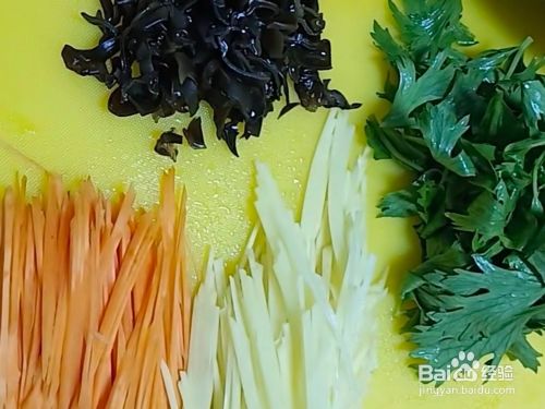先处理食材:土豆和胡萝卜星际切丝、木耳泡发切丝、芹菜叶洗干净,备用。