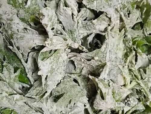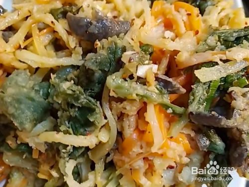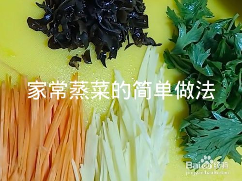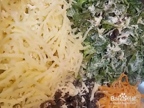 再给芹菜叶撒上一把面粉,拌匀备用。土豆丝、胡萝卜丝和木耳丝也是各自拌匀备用。