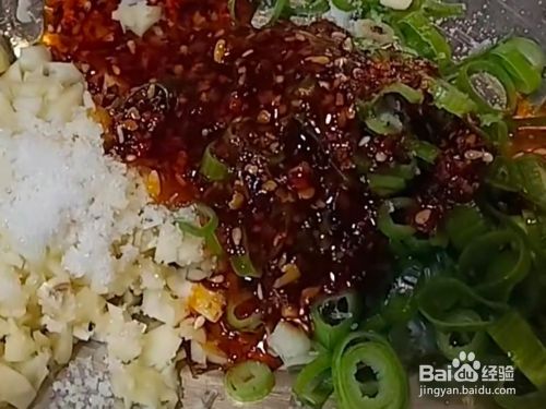 再取一个空盆,放一点葱花蒜末、加上盐、味精、白砂糖,辣椒油,酱油,陈醋。