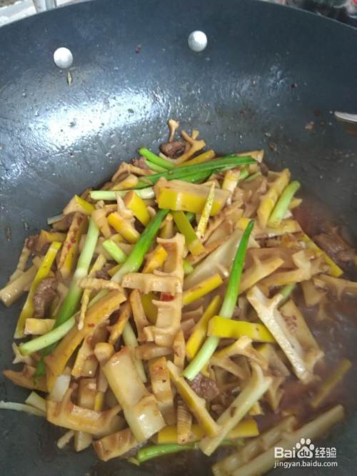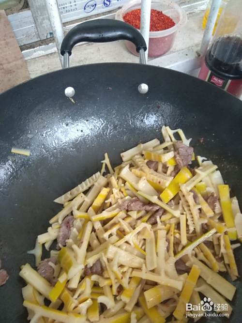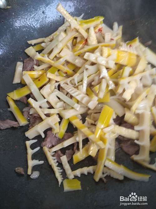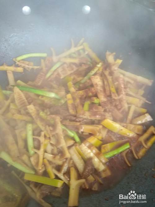然后把竹笋放入到锅内,一并进行翻炒,如图所示。