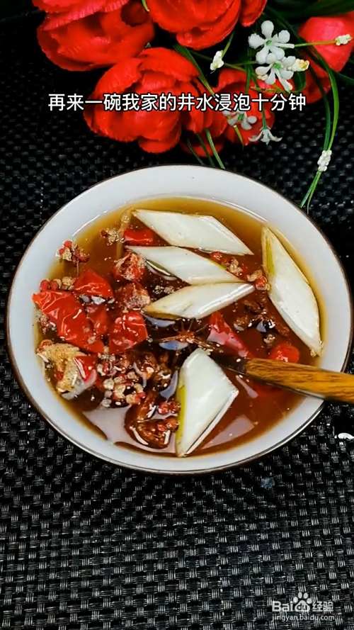 碗中放入葱姜、干辣椒、花椒、八角,倒入清水浸泡十分钟。