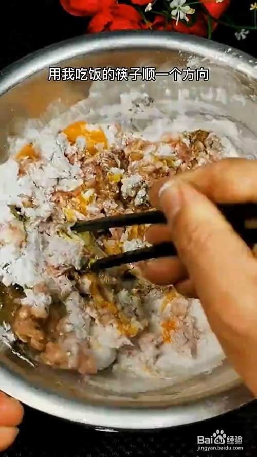 肉馅中打入鸡蛋,倒入土豆淀粉,顺着一个方向搅拌均匀。