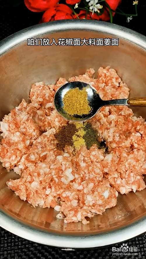 猪肉馅放入花椒面、大料面、姜面、十三香、食盐、鸡粉,倒入温水搅拌均匀。