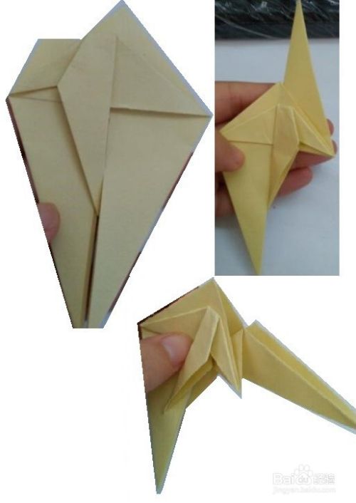 10另一侧和上边同样操作,脚折好后,我们把脊背向一侧折,把高的地方都折进去藏起来。下面折头部,先把头部打开,按照折痕像下边的折法折,捏扁后向后折。我们再把头部修饰的圆滑一些,就可以啦。
