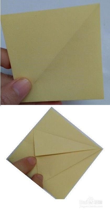1准备好一张正方形的黄色彩纸,我们先把纸两条中线对折。翻面再折两个对角线。按照折痕合拢后会形成个双正方形。