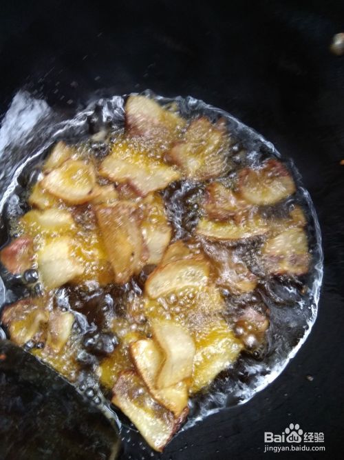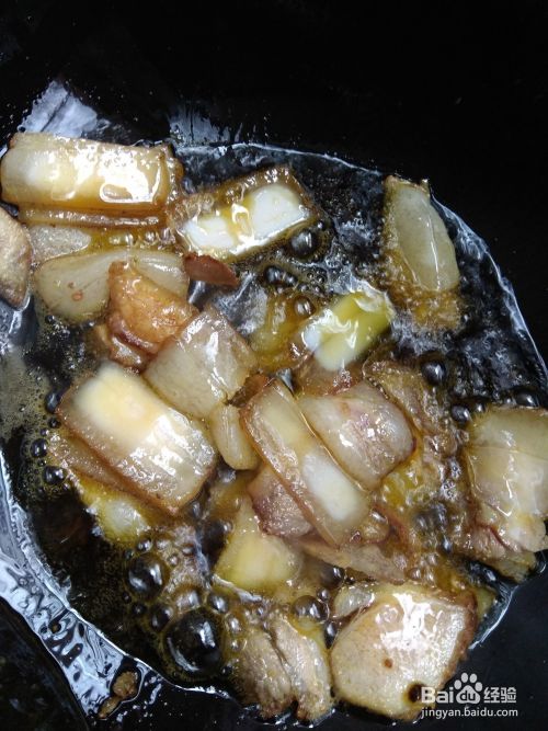 把切好的肉进行下锅,在油锅内进行小火煎炒待肉炸出油来,如图所示。