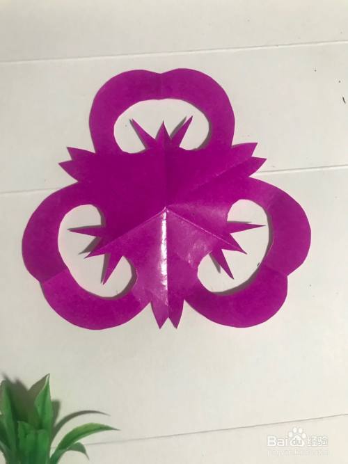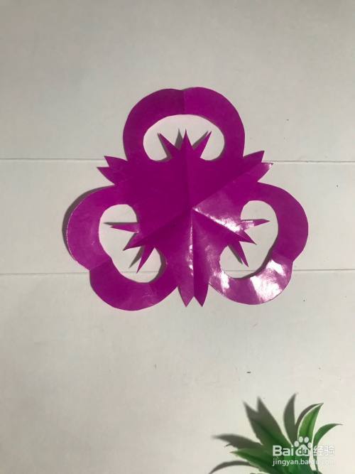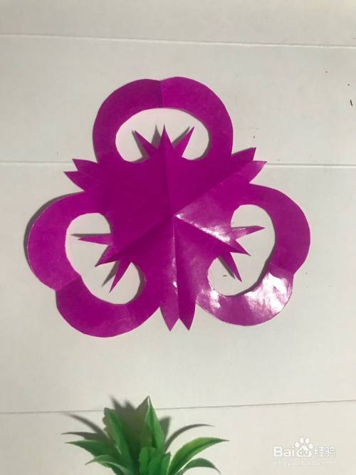 第六步 剪完外围多余的彩纸之后 再剪里面的花蕊部分 轮廓部分 还有其它涂实的部分等等 都剪完之后展开铺平 一副漂亮的三瓣花就裁剪完成了