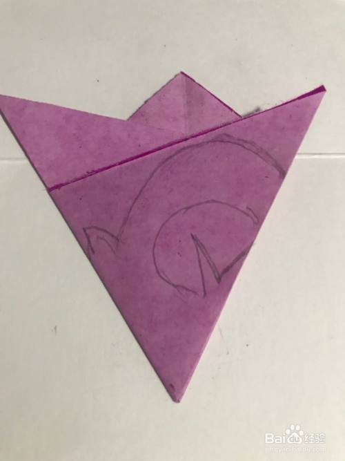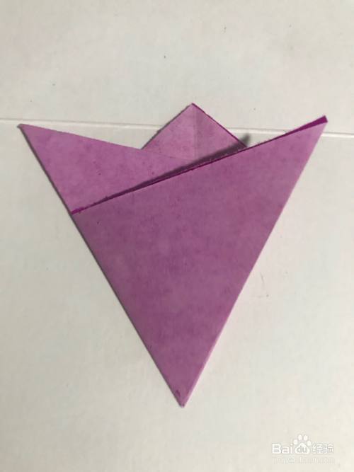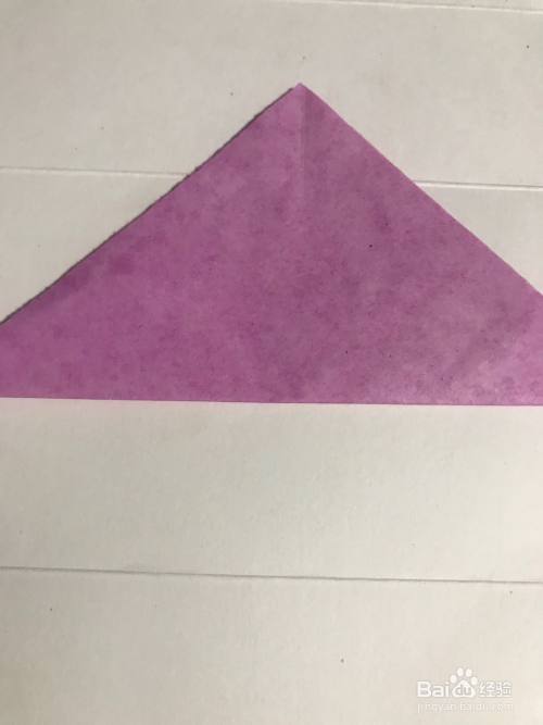 第一步 首先取一张16厘米长X16厘米宽的正方形二红色彩纸 先把它从下向上对角折叠整齐
