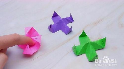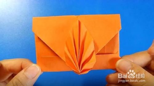 接着再将这个四方形开口的一端朝下,然后将正面和背面的两个四方形的左右两个角分别向中间的折痕进行折叠,然后再将折纸模型正面和背面的两个底角分别向上面拉开,即得到折叠样式,压展平整之后,将正面的朝上的顶角向下翻折。