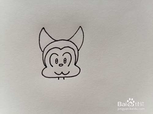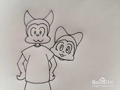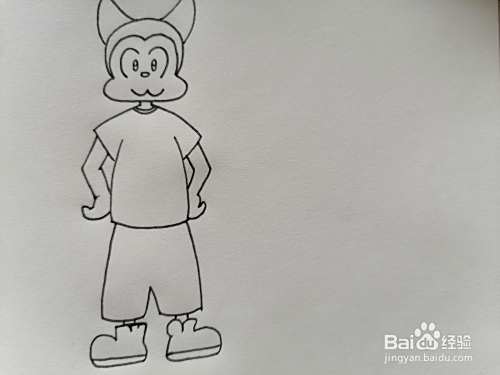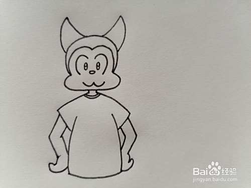 首先在纸上画出狼哥哥的头,依次画出它的身体、双手和两只穿鞋子的脚