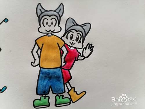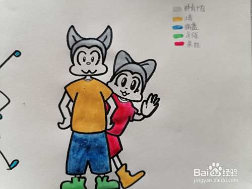 最后用土黄、深红、浅绿和湖蓝水彩涂好两兄妹身上的衣服,狼兄妹就画好啦