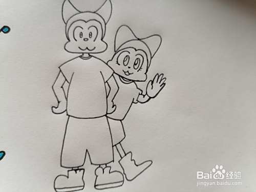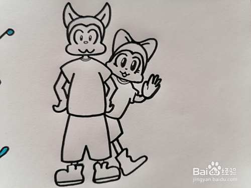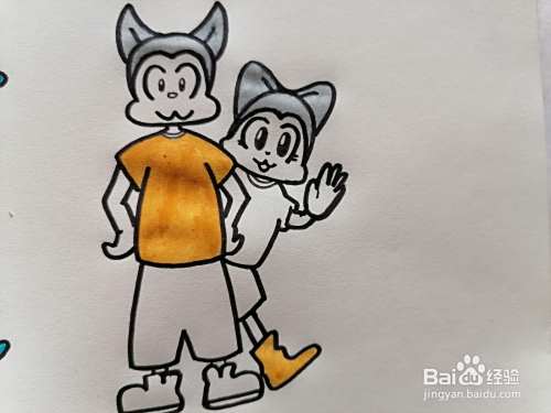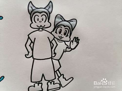 用黑色笔描黑边沿,用群青+白色水彩涂好两兄妹的头