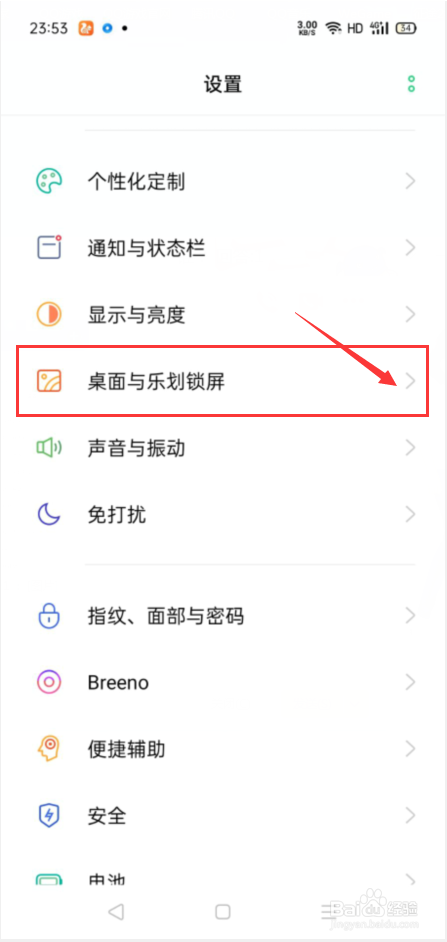 然后,我们在进入手机设置主界面后,我们点击桌面与乐划锁屏按钮,我们进入桌面与乐划锁屏设置界面;