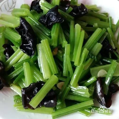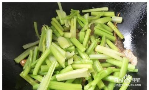 锅内倒入少许油,放入葱花蒜末炒香,放入芹菜翻炒2分钟。